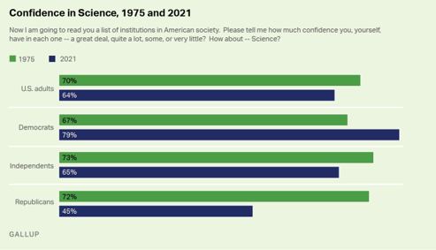 En todo caso, en una encuesta realizada por Gallup en 2021 se observó una pequeña disminución en el porcentaje de adultos estadounidenses que decían tener mucha o bastante confianza en la ciencia en comparación con un estudio realizado en 1975. El porcentaje bajó del 70 % al 64 %. Sin embargo, ese pequeño cambio oculta cambios mucho más importantes, que reflejan una total división en el apoyo a la ciencia entre demócratas y republicanos.